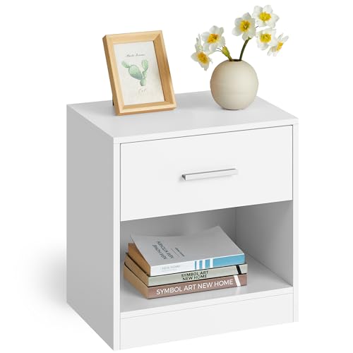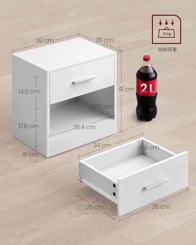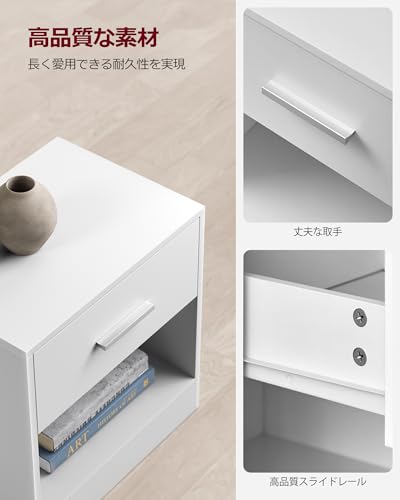 VASAGLE - فاساجيل خزانة بجانب السرير مع درج، طاولة جانبية من طبقتين، انيقة مع مقابض، رف تخزين، طاولة ليلية، لغرفة النوم/غرفة المعيشة، رف بجانب السرير، لون ابيض، LET619T14
