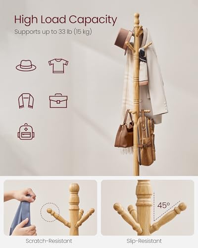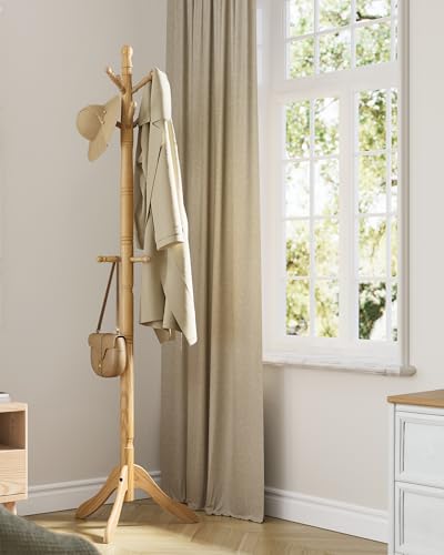 VASAGLE - حامل معاطف من الخشب الصلب، شجرة معاطف قائمة بذاتها مع 10 خطافات للقبعات والشنط والمحافظ والمدخل والرواق وخشب المطاط طراز URCR003Y01 من فاساجيل، لون بيج طبيعي