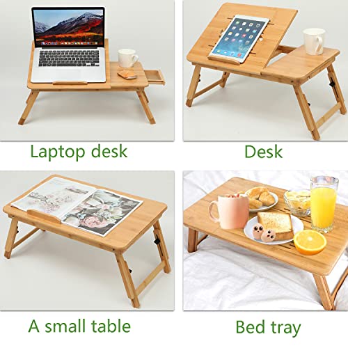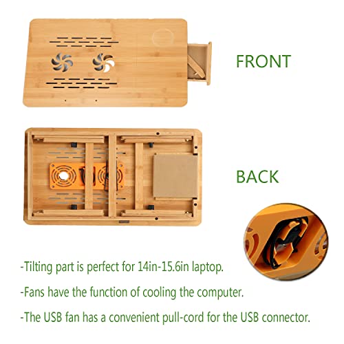 - طاولة لاب توب من الخيزران قابلة للطي والتعديل مع مروحة تبريد USB، طاولة سرير محمولة متعددة الوظائف، حامل نوت بوك وحامل للقراءة مع درج تخزين لتناول الإفطار والقراءة ومشاهدة الأفلام على السرير أو الأريكة