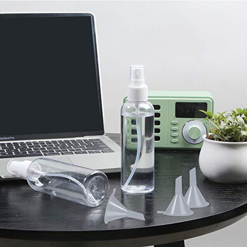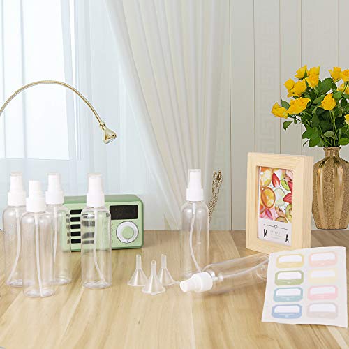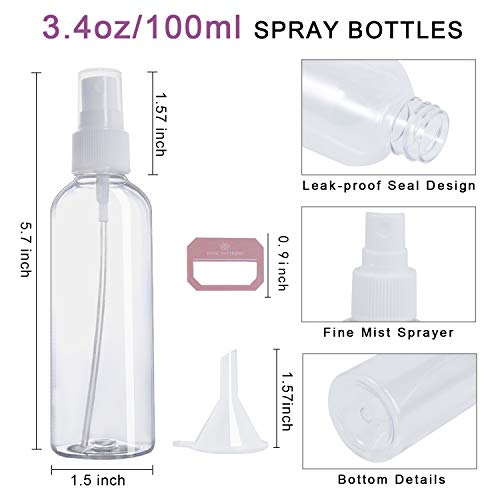 Vaupan - زجاجات بخاخة بلاستيك 3.4 اونصة/100 مل شفافة فارغة للرذاذ العطري، عبوات سفر صغيرة قابلة لاعادة التعبئة مع 3 قطع اقماع و8 قطع ملصقات لمستحضرات التنظيف والشعر والمكياج والتجميل (مجموعة من 6)