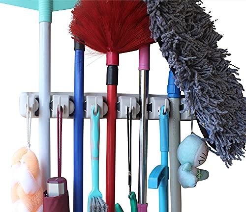 VAVSU - حامل شرشوبة ومكنسة يٌثبت على الحائط من فافسو ومنظم شديد التحمل للمنزل والحديقة والجراج رف تخزين مزود بـ 5 أوضاع مع 6 خطافات بلاستيك