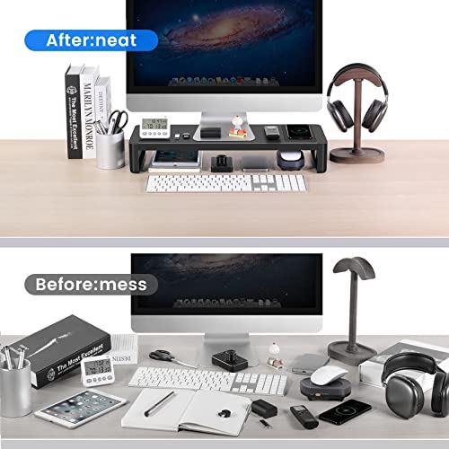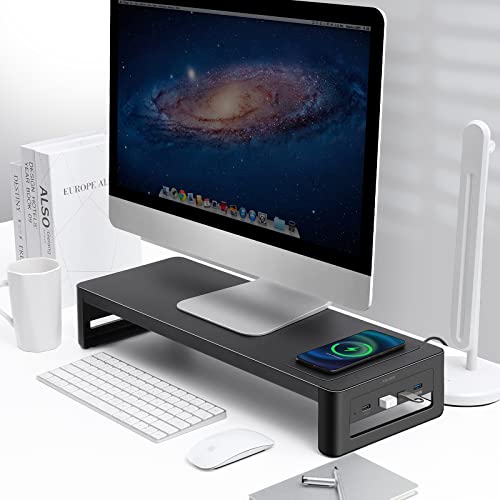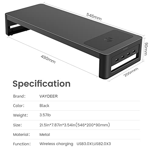 VAYDEER - حامل شاشة Vaydeer مع شحن لاسلكي ومنافذ USB 3.0 - 2.0 ، حامل حامل الكمبيوتر الصلب للمكتب ، حامل شاشة الكمبيوتر الشخصي للمكتب ، الكمبيوتر المحمول ، الكمبيوتر ، iMac ، الطابعة حتى 32 بوصة - أسود
