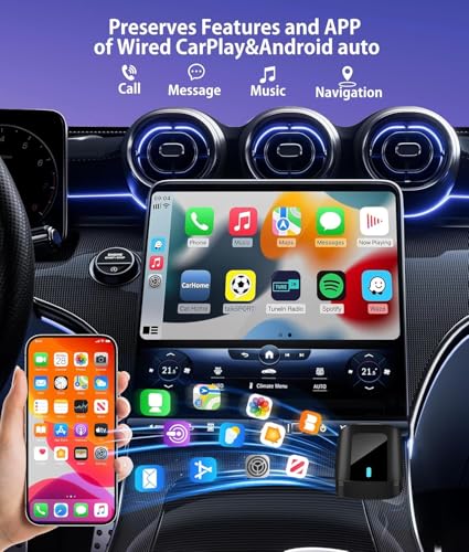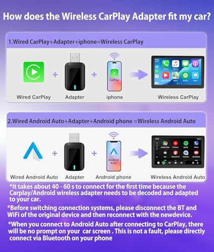 - 【محول كاربلاي لاسلكي】مع محول كاربلاي اللاسلكي 2 في 1، يمكنك تحويل نظام كاربلاي/اندرويد التلقائي السلكي الحالي إلى لاسلكي دون أي متاعب! يمكنك الاستمرار في استخدام وظيفة كاربلاي/اندرويد اوتو الكاملة والحفاظ على تشغيل السيارة الأصلي، مثل التنقل وتشغيل الموسيقى ومساعد سيري والمكالمات الهاتفية وما إلى ذلك.