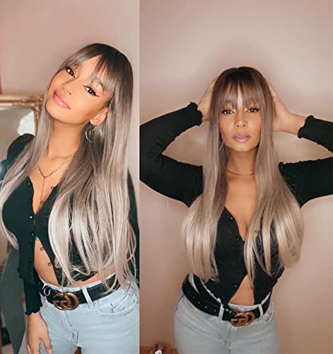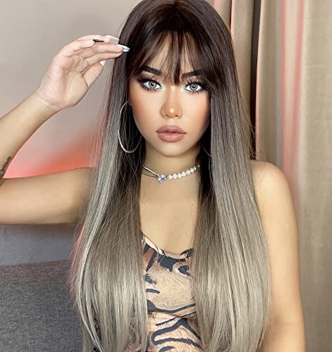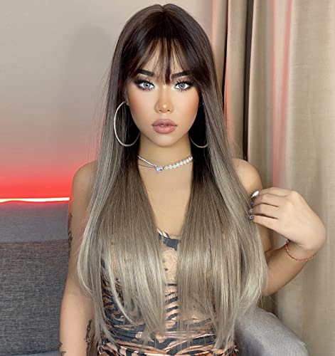 VEBONNY - شعر مستعار 159 متدرج مع شراشيب من فيبوني بني وفضي واشقر رمادي للنساء صناعي بدون لاصق افريقي طويل مفرود 56 سم