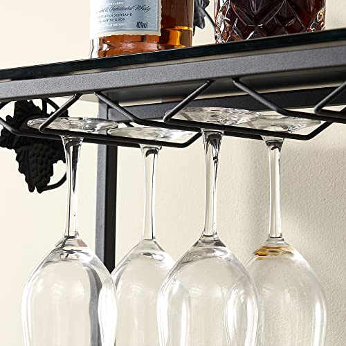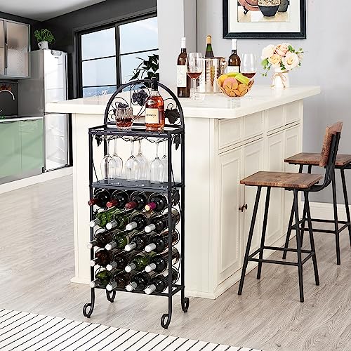 VECELO - رف لزجاجات النبيذ من المعدن يتسع لـ20 زجاجة مع رف أكواب ورف تخزين وعرض مستقل للمطبخ وغرفة الطعام وغرفة المعيشة بسطح زجاجي من فيسيلو، أسود