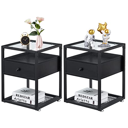 VECELO - فيسيلو طاولة جانبية عصرية مع رف علوي من الزجاج المقوى درج واطار معدني ديكور منزلي لغرفة المعيشة وغرفة النوم مجموعة 2 اسود