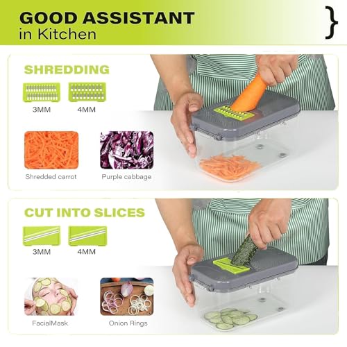 - 【مجموعة ملحقات المطبخ 22 في 1】 تتضمن قطاعة الخضروات متعددة الوظائف هذه 13 شفرة قابلة للتبديل للتقطيع والفرم والبشر والتشريح، بالإضافة إلى واقي يد وفرشاة تنظيف وقطاعة بيض وسلة تصريف قابلة للطي وغطاء مقاوم للغبار. سواء كنت تحضر الفواكه أو الخضروات أو الجبن، فإن هذه المجموعة الشاملة تسمح لك بتخصيص حجم القطع والتصميم دون عناء لتناسب أي وصفة.