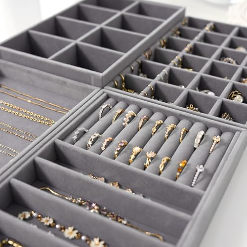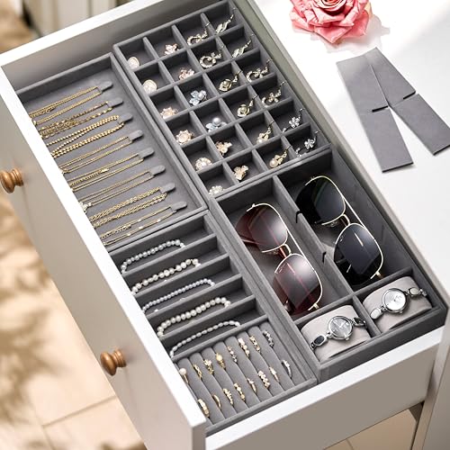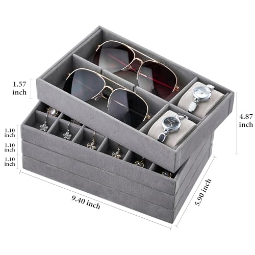- مجموعة صواني مجوهرات مخملية مكونة من 4 قطع - يتضمن منظم المجوهرات القابل للتكديس هذا 4 حشوات صينية مجوهرات لتخزين وعرض الخواتم والأقراط والقلائد والأساور والساعات والنظارات الشمسية وما إلى ذلك. شاهد مجموعتك بسهولة واعثر على ما تحتاجه في ثوانٍ - لا مزيد من السلاسل المتشابكة أو القطع المفقودة.