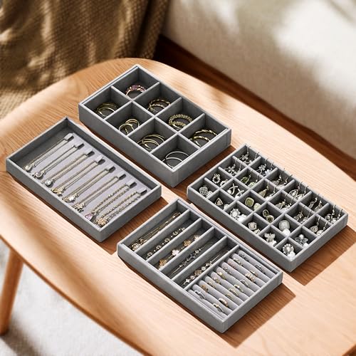 pickpiff - صواني تنظيم مجوهرات مخملية - مجموعة حشوات تخزين منظم مجوهرات قابلة للتكديس، مجموعة صواني مجوهرات من 4 طبقات للاقراط والخواتم والقلائد والاساور مع فواصل قابلة للازالة لخزانة الملابس وطاولة الزينة