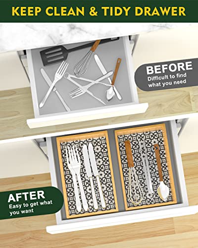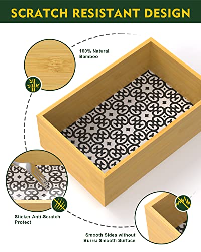 - [مادة الخيزران المتجددة]: صندوق التخزين المنظم للأدراج مصنوع من الخيزران المتين عالي الجودة، وهو بديل رائع للبلاستيك لأنه مادة متجددة ومستدامة. وسطح منظم الخيزران معالج بطلاء عالي الجودة غير سام وبدون رائحة، مما يجعله يظهر براعة ممتازة وفنون وحرف جميلة.