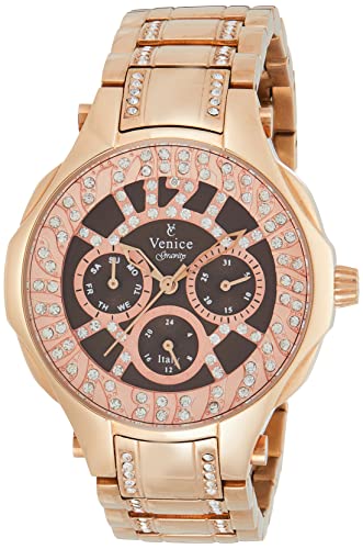 Venice - ساعة انالوج بعقارب دائرية من الستانلس ستيل بمينا بلون بني مزين بفصوص للنساء فينس SV4012-IPR-C - ذهبي