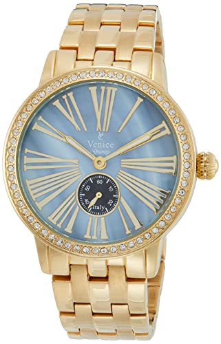 Venice - ساعة أنالوج دائرية بعقارب من الفولاذ المقاوم للصدأ بإطار مزين بفصوص أحجار ومينا بلون رمادي للنساء من فينيس، (V8119-IPG-BL) - ذهبي