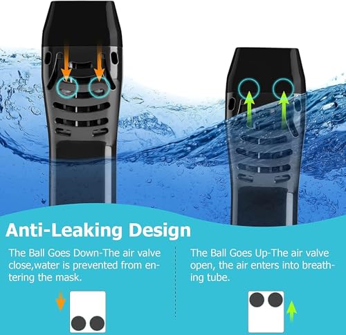 - 3. جافة بالكامل ومقاومة للماء: أنبوب تنفس مقاوم للماء وجاف بالكامل، يتنفس بإحكام ومقاوم للماء. صمام كروي محكم الغوص، عند غمر الماء، يمكن للصمام العلوي المقاوم للماء لنظام دريدروب أن يمنع الماء من الدخول إلى أنبوب الغوص.