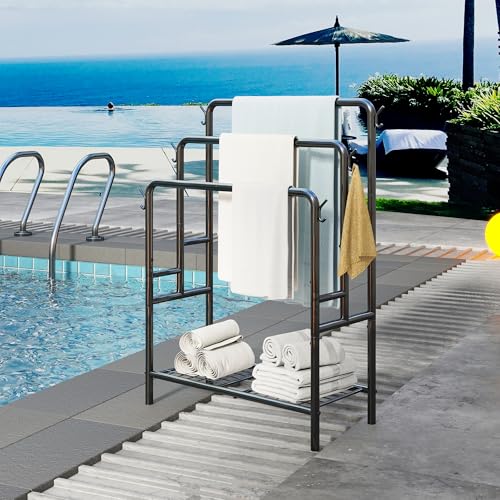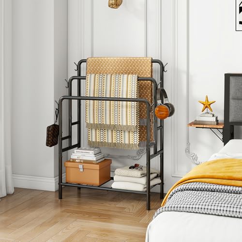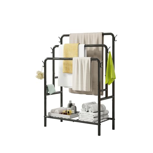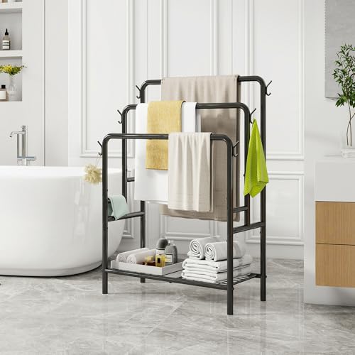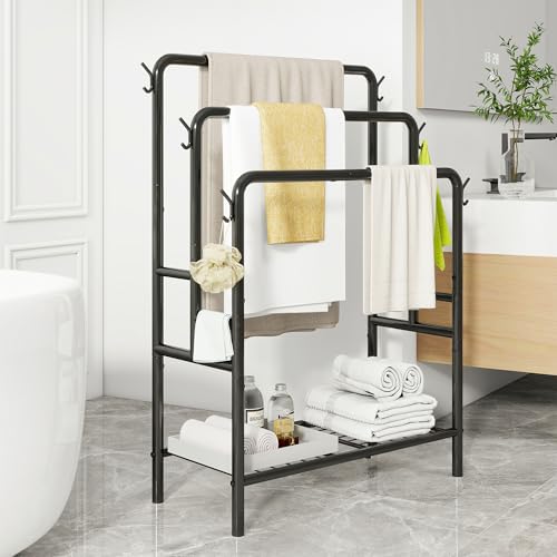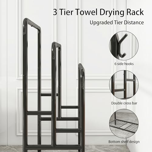 VERFARM - رف مناشف قائم بذاته من فيرفارم، حامل مناشف معدني من 3 طبقات، حامل تجفيف مع رف تخزين، 6 خطافات، رف بطانيات لتنظيم ملحقات الحمام، تخزين مناشف اليد والحمام، اسود