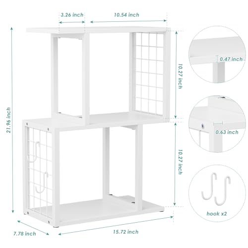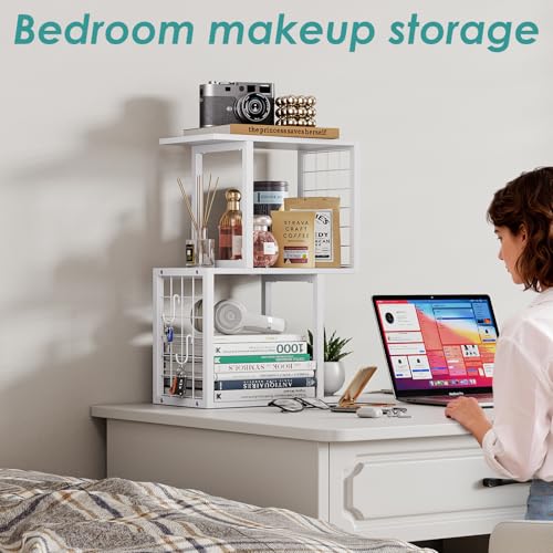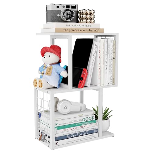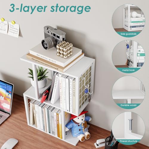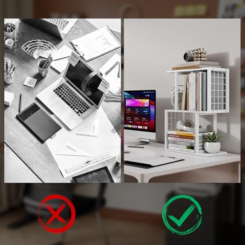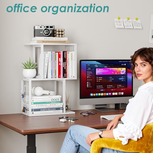 Vfelf - منظم رف كتب لسطح المكتب من فيلف، رف مكتب ابيض من 3 طبقات مع خطاف معدني، منظمات مساحة العمل لتنظيم المكتب وخزانة الكتب
