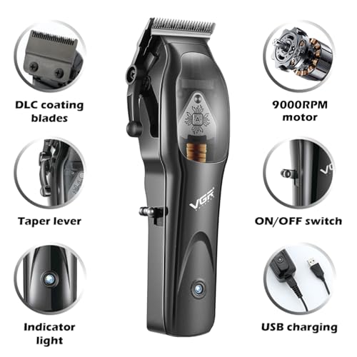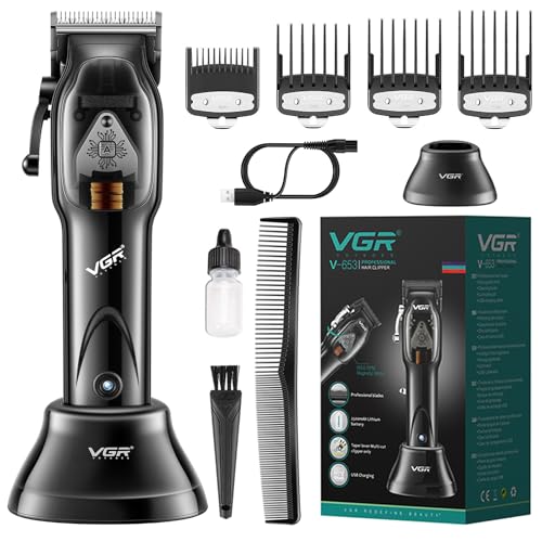 VGR - ماكينة حلاقة الشعر احترافية 653 للرجال من في جي ار، ماكينة حلاقة وتشذيب 9000 دورة في الدقيقة لقص الشعر، مجموعة قص اللاسلكية الشعر للرجال قابلة لإعادة الشحن بمنفذ USB، لون أسود
