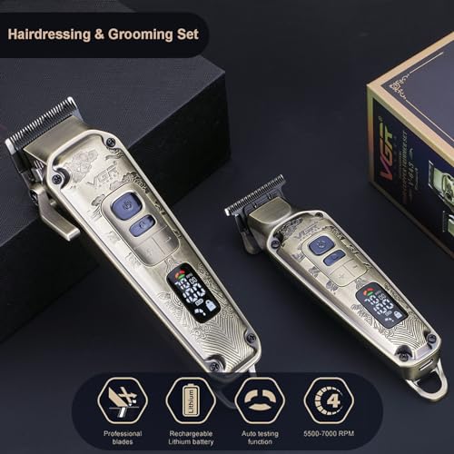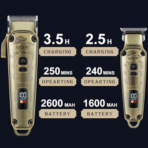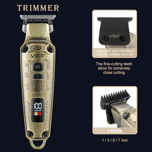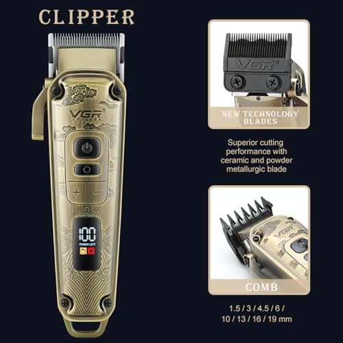 VGR - ماكينة حلاقة الشعر الاحترافية للرجال من في جي ار - مقصات شعر سلكية ولاسلكية، مزودة بشفرة تي - بليد زيرو صلبة، شاشة إل إي دي، مجموعة قص الشعر، منتجات حلاقة