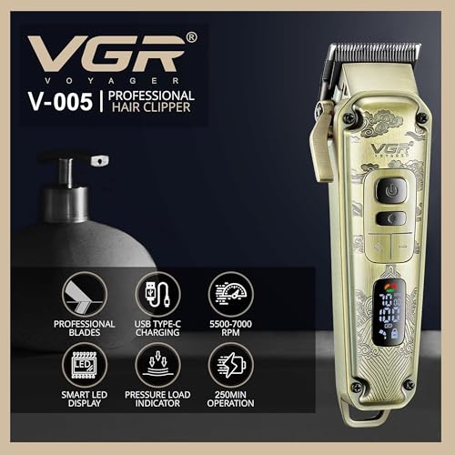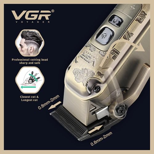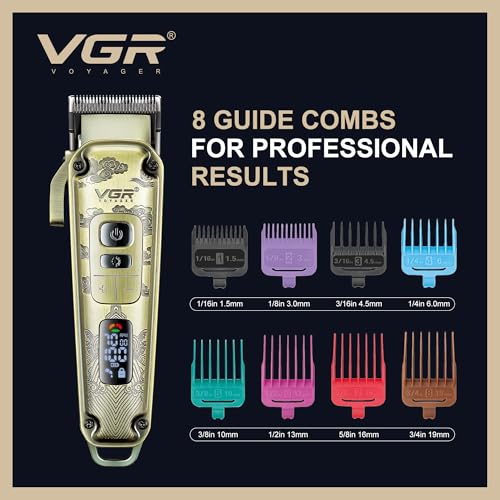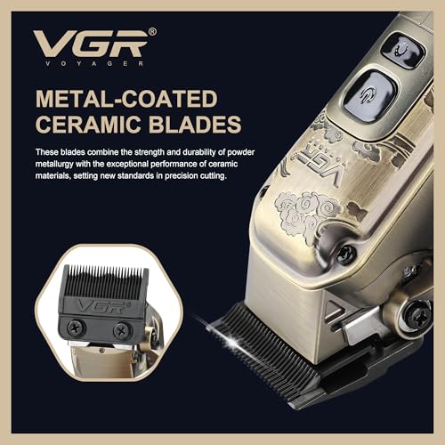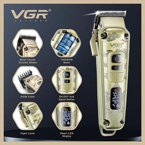 VGR - ماكينة حلاقة شعر لاسلكية للرجال مع مقبض مدبب من في جي ار - مجموعة حلاقة شعر كهربائية لقص شعر الرأس مع شفرات سيراميك - 7000 دورة في الدقيقة، قابلة لإعادة الشحن عبر بطارية USB-C 250 دقيقة، سرعات متعددة