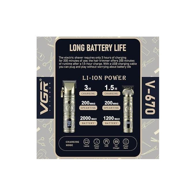 - بطارية قابلة لإعادة الشحن: ماكينة حلاقة الشعر وماكينة التشذيب قابلين لإعادة الشحن وتتميز بعمر بطارية طويل.