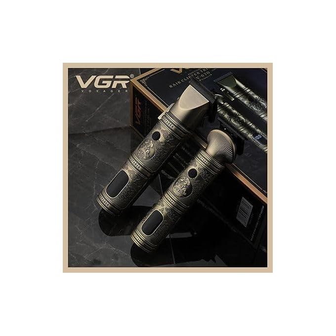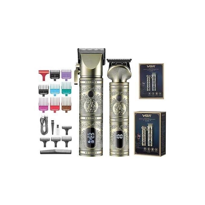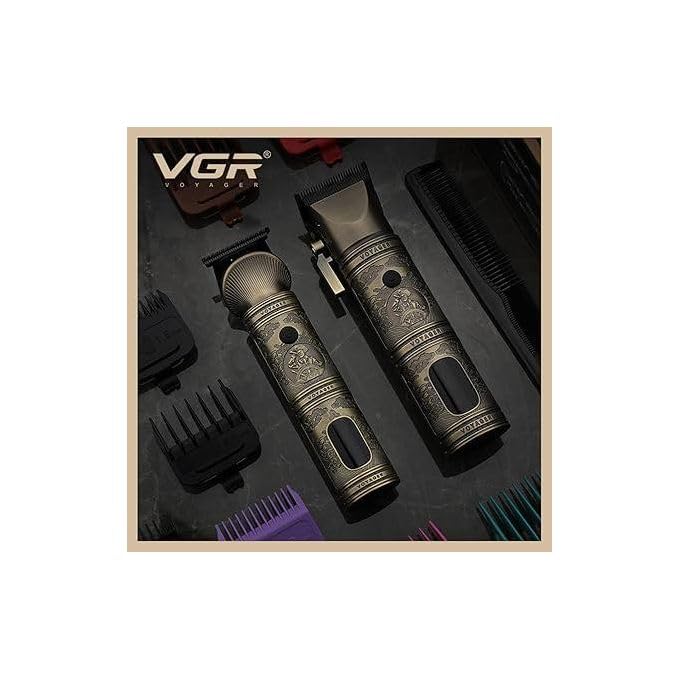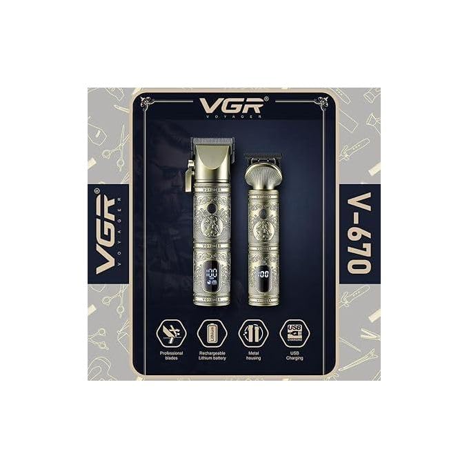 VGR - مجموعة ماكينة حلاقة وتشذيب الشعر الاحترافية من في جي ار مع شفرات احترافية وبطارية قابلة لإعادة الشحن وهيكل معدني وشحن عبر منفذ USB وقفل سفر وفرشاة تنظيف وزيت تشحيم - V-670