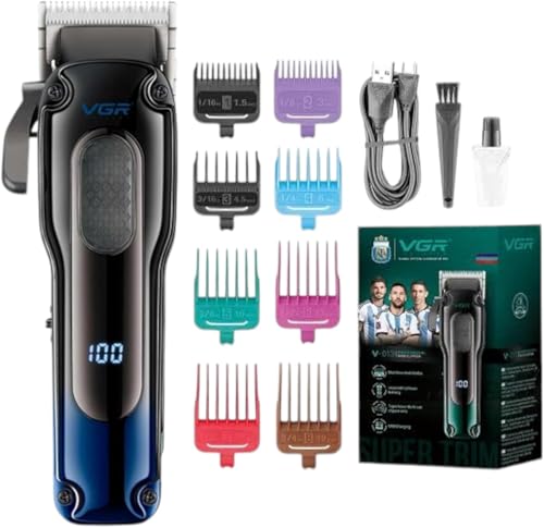 VGR - ماكينة حلاقة شعر احترافية بجودة صالونات التجميل V-013 من في جي ار - وقت تشغيل 200 دقيقة، بطارية ليثيوم 2000 ميلي امبير في الساعة، ذراع مدبب قابل للتعديل، 8 أمشاط توجيه، شاشة ال اي دي