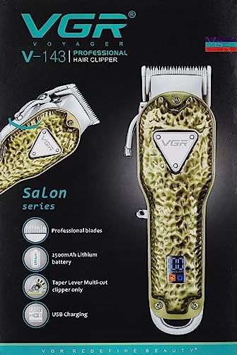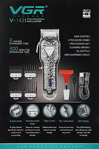 VGR - ماكينة حلاقة احترافية معدنية قابلة لاعادة الشحن من في جي ار بمنفذ USB وتهذيب الشعر الكهربائية اللاسلكية للرجال موديل V-143