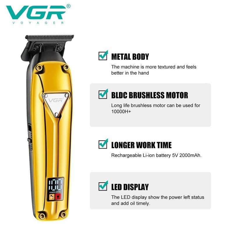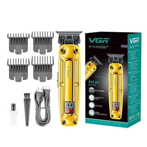 VGR - ماكينة تشذيب الشعر V- 904 فائقة الجودة بدون فراغات بطلاء دي ال سي وشفرة معدنية ومحرك بدون فرش 10000 ساعة وشاشة رقمية وبطارية 2000mAh بسلك/لاسلكية وشحن USB نوع C وتشغيل 200 دقيقة من في جي ار، لون ذهبي