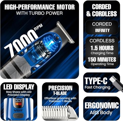 Generic - ماكينة حلاقة VGR V-981 بسرعتين تيربو تعمل حتى 150 دقيقة أو ساعتين و نصف متواصلين بشاشه ديجيتال ملونه (أزرق و أسود)
