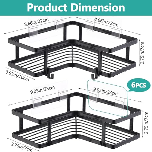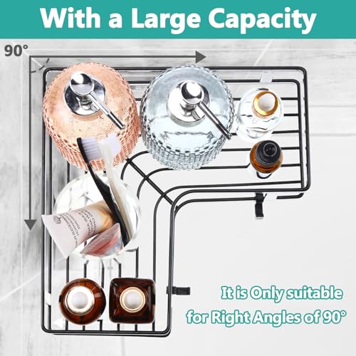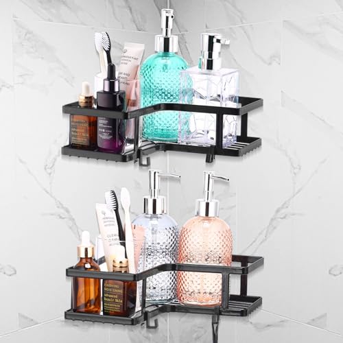 - حامل دش زاوية، عبوة من 2 رف منظم لزاوية الدش اللاصق، رف تخزين دش من الستانلس ستيل بدون حفر مع خطافات وحامل معجون الأسنان للحمام والمسكن والمطبخ