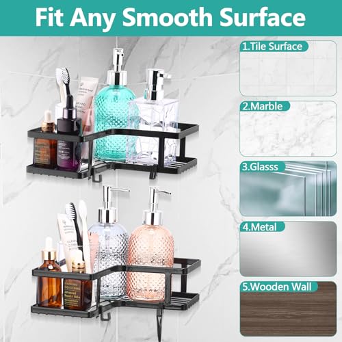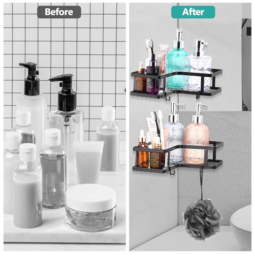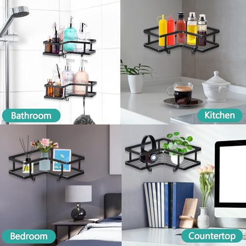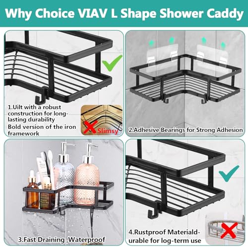 VIAV - حامل دش زاوية، عبوة من قطعتين من ارفف تنظيم زاوية الدش اللاصقة، رف تخزين دش من الستانلس ستيل بدون ثقب مع خطافات وحامل معجون اسنان للحمام والمسكن والمطبخ (اسود)