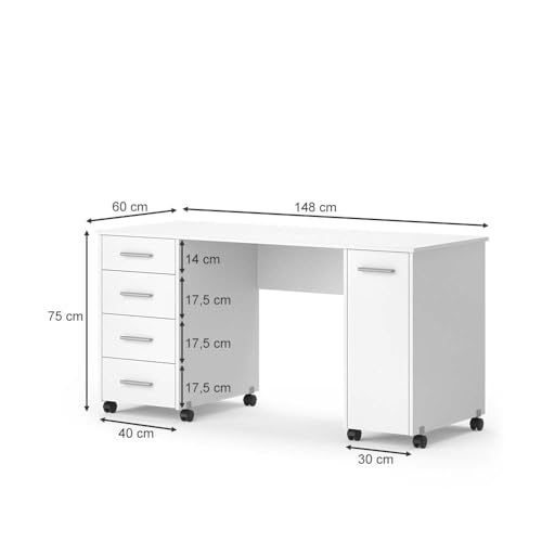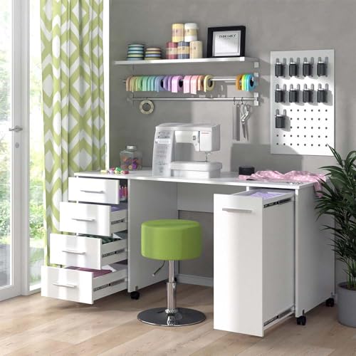 Vicco - طاولة خياطة فيرونا بعجلات من فيكو مقاس 148 × 75 × 60 سم، طاولة حرف يدوية بيضاء مع 4 أدراج، مادة صناعية