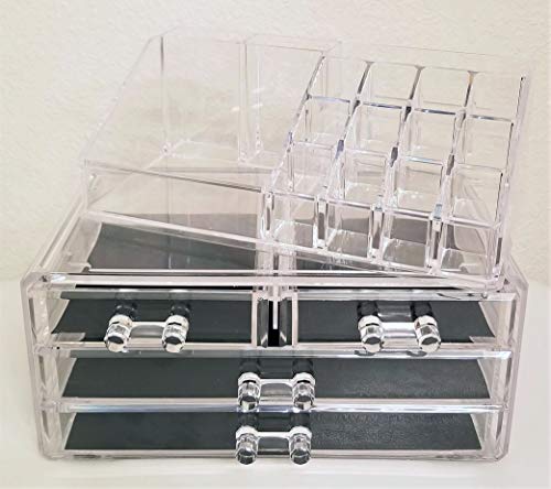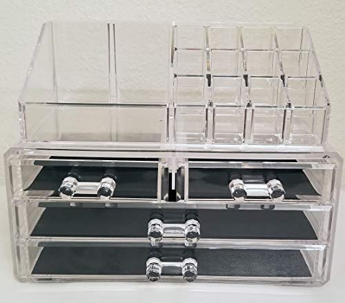 - مساحات تخزين متعددة - اثنا عشر فتحة لأحمر الشفاه أو الفرشاة - أربعة مساحات تخزين بأحجام مختلفة لطلاء الأظافر أو أدوات الحمام أو غيرها من الملحقات المختلفة التي تحتاج إلى تخزين، أربعة أدراج منزلقة لسهولة الوصول إلى الماسكارا أو البودرة المضغوطة أو منظمات الشعر أو المجوهرات.