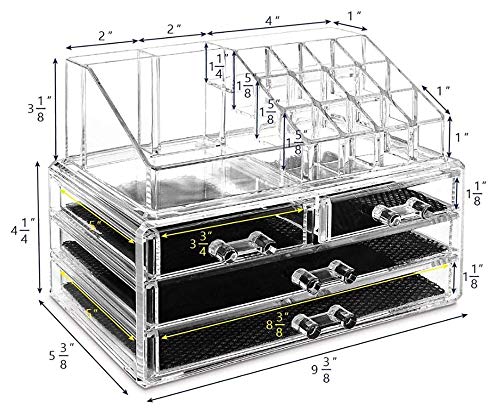 - استخدامات متعددة - المكياج والمجوهرات والحلي والكنوز بالإضافة الأغراض الصغيرة التي ستناسبها جميعًا تمامًا. تأتي مع مربعات شبكية سوداء ناعمة وغير قابلة للانزلاق في الأدراج للحفاظ على أغراضك في مكانها وحمايتها من الخدش.