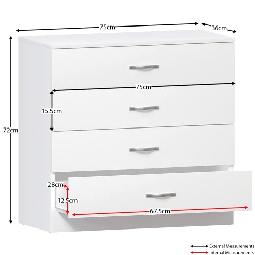 - مساحة تخزين واسعة وعملية: يتميز الدولاب بأربعة أدراج واسعة، يأتي كل منها بأبعاد داخلية بارتفاع: 12.5 / العرض: 67.5 / العمق: 28 سم. توفر هذه الأدراج مساحة واسعة لتخزين الملابس المطوية والاكسسوارات وغيرها من مستلزمات غرفة النوم، مما يساعدك على الحفاظ على غرفة نومك منظمة وخالية من الفوضى.