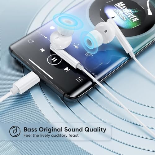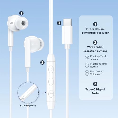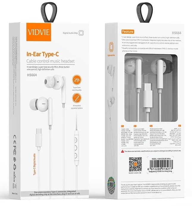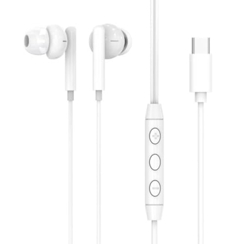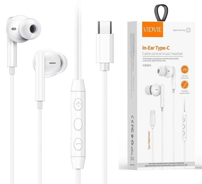 VIDVIE - فيدفي سماعة اذن سلكية من النوع سي وميكروفون وتحكم في مستوى الصوت متوافقة مع جميع جوالات واجهزة اندرويد، داخل الأذن، أبيض