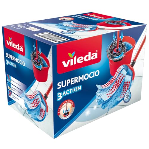 Vileda - مساحة موب 3 اكشن سوبر موكسيو، مساحة موب كبيرة من المايكروفايبر مع 3 قطع من الألياف، مجموعة صندوق موسيو ودلو، تزيل اكثر من 99% من البكتيريا بالماء فقط من فيليدا