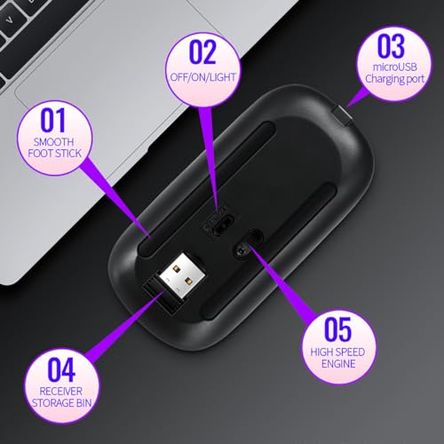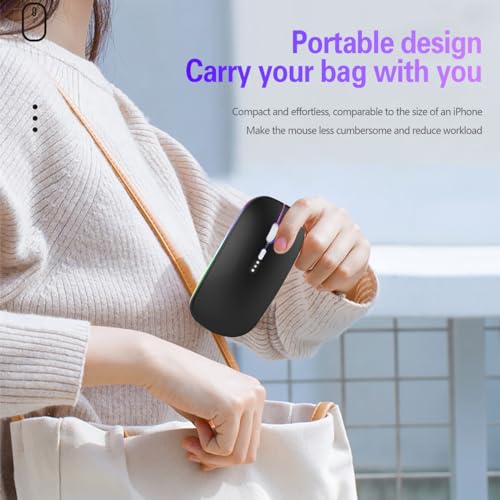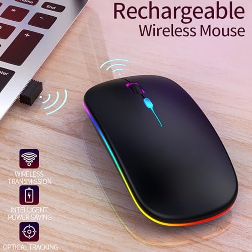 Vinmooog - ماوس بلوتوث لاسلكي مريح قابل لاعادة الشحن من فينمووج، ماوس العاب باضاءة خلفية 7 الوان 3 نقطة لكل بوصة مع مستقبل USB 2.4 جيجاهرتز (اسود)