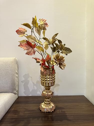 Generic - مزهرية زهور معدنية ذهبية عتيقة، حامل مزخرف مزخرف مع اوراق الخريف الاصطناعية، قطعة مركزية انيقة لديكور المنزل
