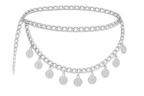 Generic - حزام سلسلة فضي عتيق مع دلايات على شكل عملات معدنية - حزام خصر للنساء