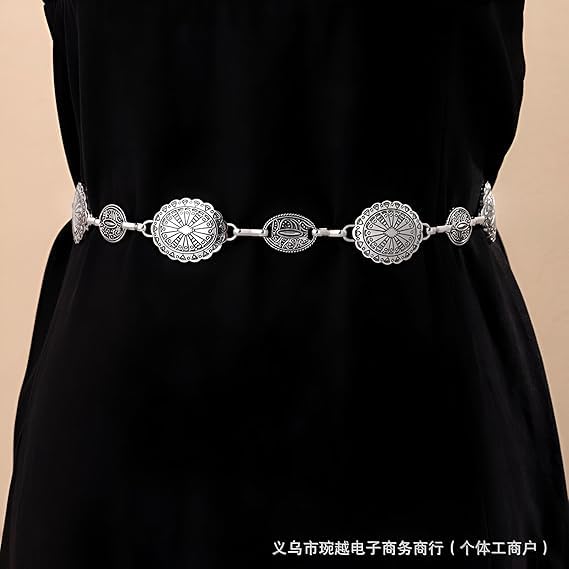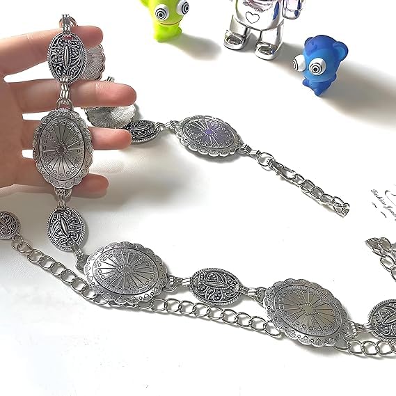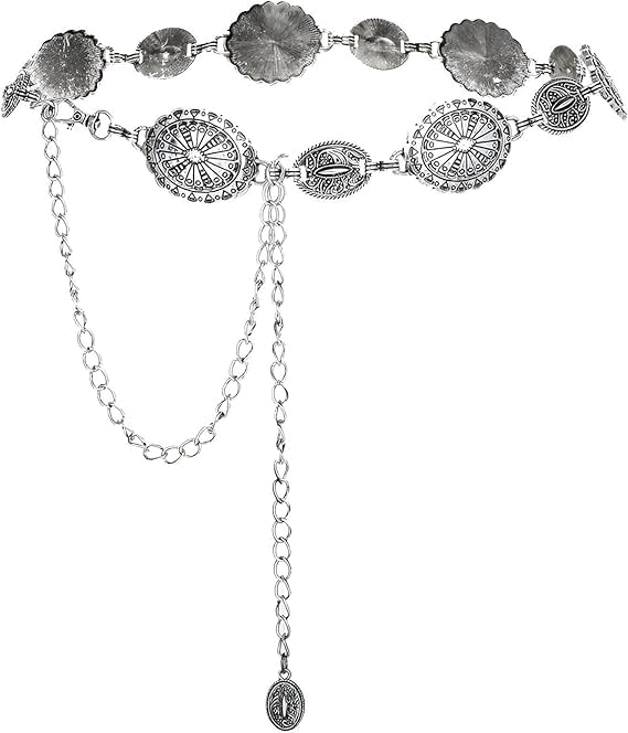Generic - حزام سلسلة بطراز عتيق، تصميم ميدالية فضية عتيقة مع سلاسل تعليق، طول قابل للتعديل