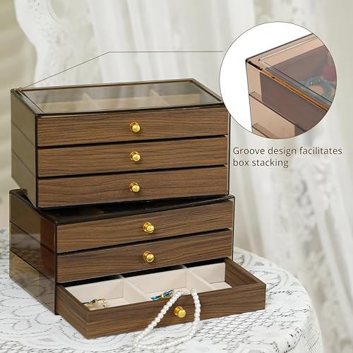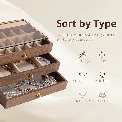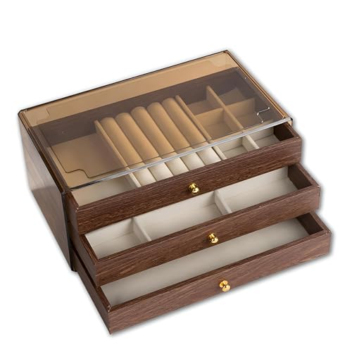 Generic - حافظة مجوهرات بتصميم فينتاج - ادراج خشبية من 3 طبقات مع غطاء اكريليك شفاف، توفر مساحة تخزين آمنة وأنيقة للخواتم والاقراط والقلائد والأساور.