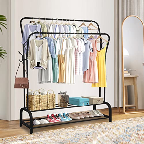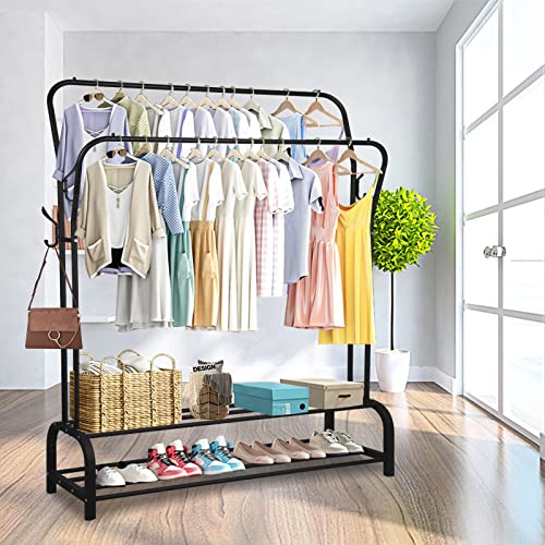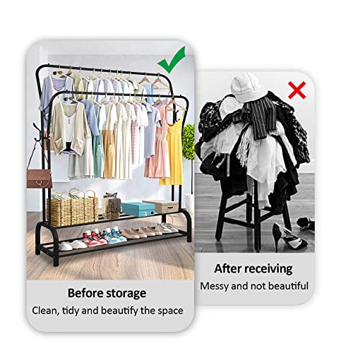 - سعة مذهلة: يمكن لرف الملابس المثالي تلبية احتياجاتك اليومية. يمكن أن يستوعب قضيبان للملابس ضعف عدد الملابس، ويتميز الجزء السفلي برف أحذية من طبقتين للأحذية وصناديق الأحذية. بالإضافة إلى ذلك، يمكن استخدام الخطافات على كلا الجانبين لتعليق القبعات والحقائب وما إلى ذلك.