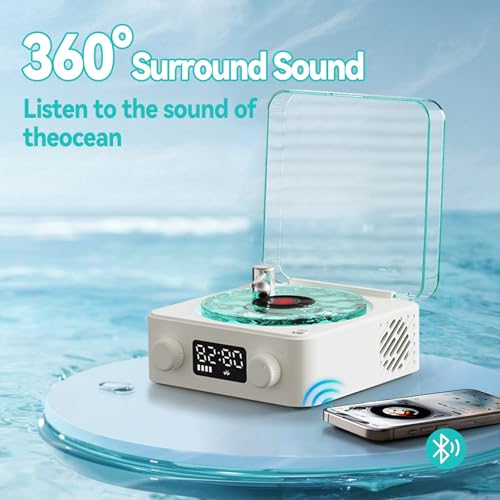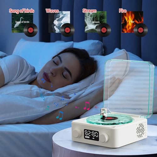 - أربعة أصوات طبيعية: مكبر صوت فينيل محمول مع أربعة أصوات طبيعية: أمواج البحر ونيران المخيم والطيور والحشرات والنقيق وتيارات الغرغرة. اجلب أصوات الطبيعة المهدئة إلى غرفة نومك وقم بتحسين جودة نومك.