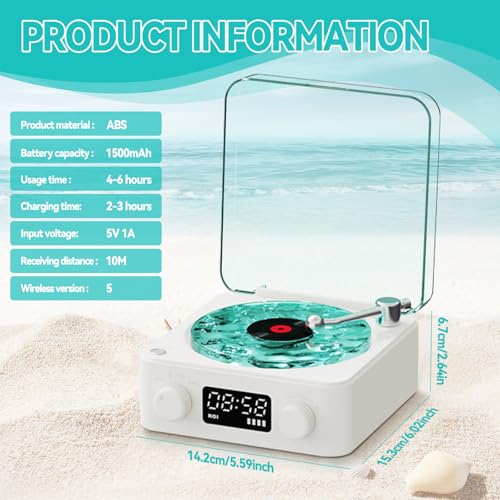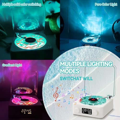 Gotrain - مكبر صوت موجي وبتصميم ريترو، مشغل أسطوانات فينيل صغير بتصميم ريترو أبيض محمول مع 4 أصوات من الطبيعة، مكبر صوت فينيل محمول مع إضاءة ار جي بي (أبيض)