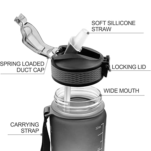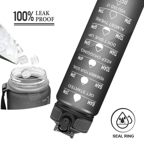 VIO - زجاجة مياه من فيو بسعة 1 لتر بشفاطة وإشارات زمنية تحفيزية للوقت، زجاجة مشروبات للبنات والأولاد لتمارين اللياقة البدنية والتمارين الخارجية وركوب الدراجات وصالة الألعاب الرياضية والمدرسة (أسود)