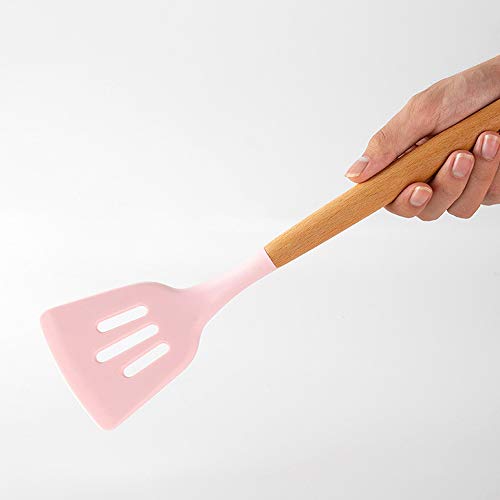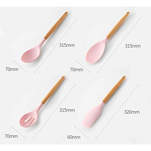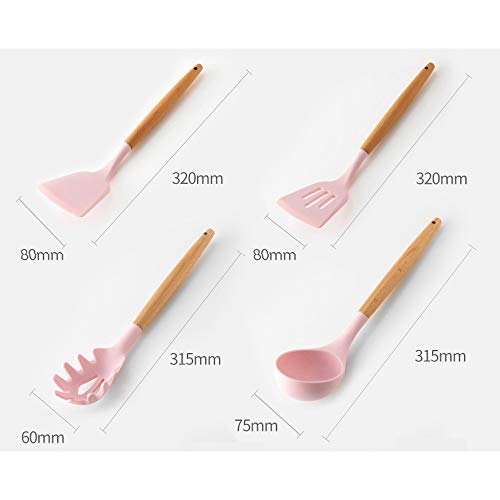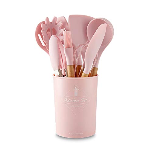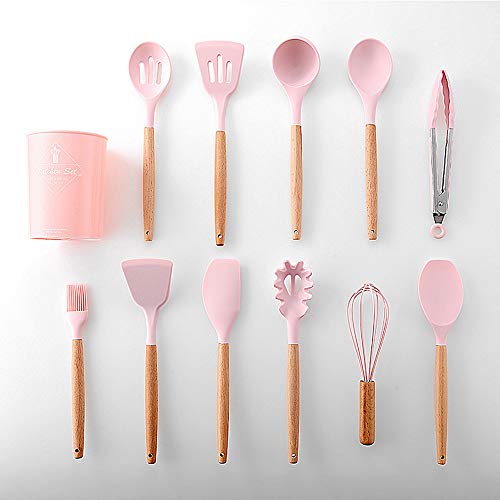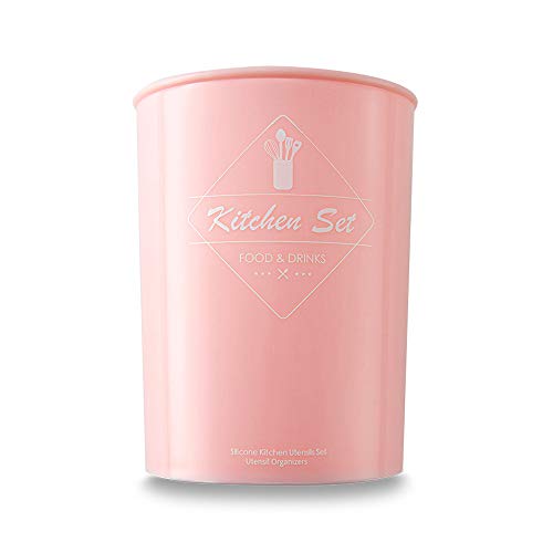 VOANZO - مجموعة اكسسوارات طهي من السيليكون بلون وردي من فوانزو - مجموعة من 11 قطعة (بما في ذلك جردل التخزين) وأداة تكثيف وملعقة مسطحة وملعقة مكرونة وجاروف وفرشاة ومضرب بيض وملقط الطعام