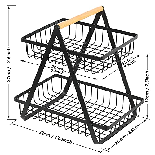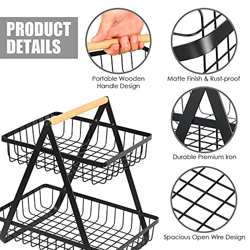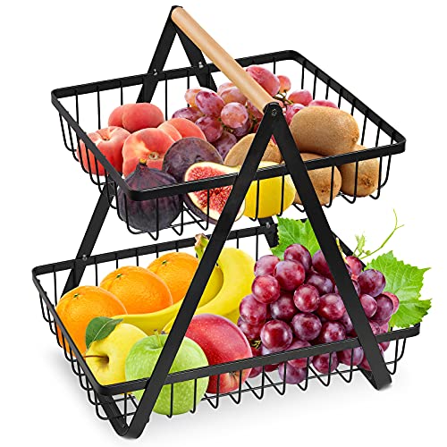Voency - سلة فواكه من طبقتين فوينسي حامل تخزين الفاكهة لسطح طاولة المطبخ فاكهة بمقبض خشبي رف لتخزين والخضروات والخبز والوجبات الخفيفة أسود