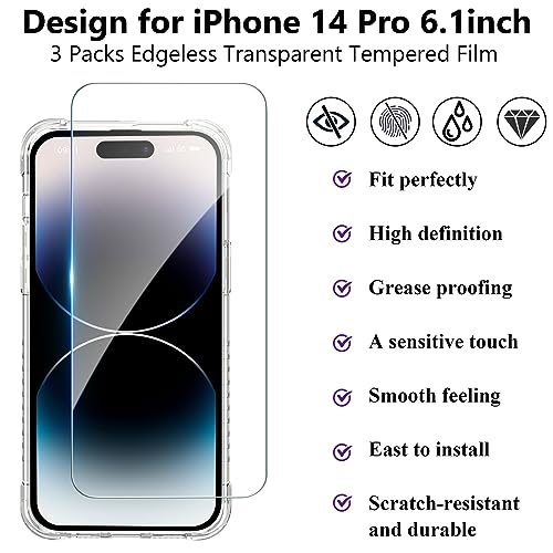 - 【3 قطع من الزجاج المقسى】حافظة حماية ايفون 14 برو مدمجة في 3 قطع 9 اتش فائقة النحافة HD بدون حواف شاشة حماية عالية الدقة تحمي هاتفك لمنع الخدوش والخدوش والصدمات وأي حوادث أخرى مع الحفاظ على حساسية الاستجابة الأصلية. يمكن استبدال 3 عبوات من الغشاء المقوى حسب الرغبة، باستخدام وقت أطول..