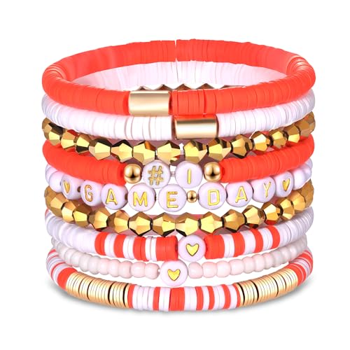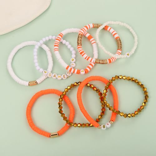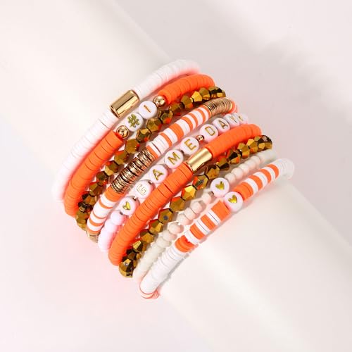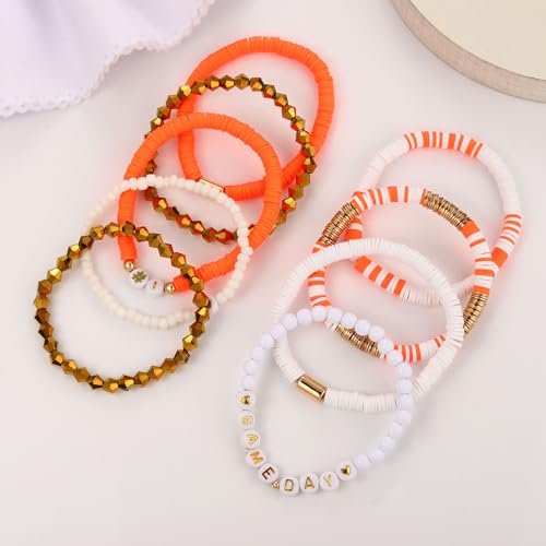 VOGUEKNOCK - فوغنوك 9 قطع من اساور يوم اللعب للنساء سوار هيشي قابل للتكديس الخرز القابل للتمدد لمشجعي رياضة كرة القدم والبيسبول رياضي لمحبي الالعاب الرياضية اكسسوارات مجوهرات هدايا برتقالي وابيض