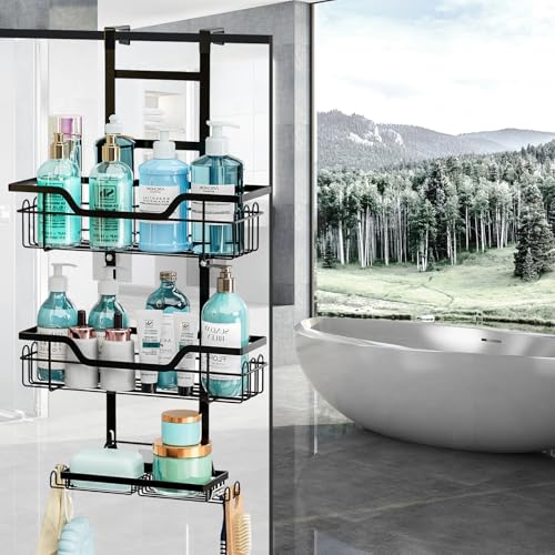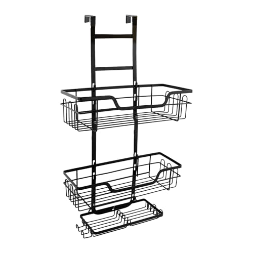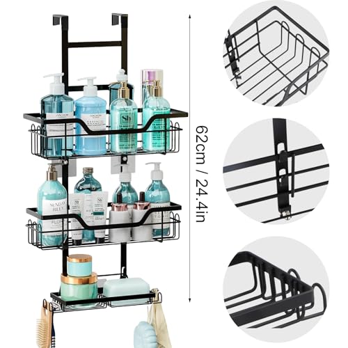 volumoon - حامل دش من فولومون، حامل دش معلق من 3 طبقات، ستانلس ستيل مقاوم للصدا مع طبق صابون، رف دش فوق الباب، رف استحمام، للشامبو وجل الاستحمام، ماكينة الحلاقة، الصابون، اسود